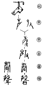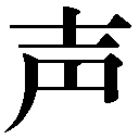 会意。声は、石板をぶらさげてたたいて音を出す、磬ケイという楽器を描いた象形文字。殳は、磬をたたく棒を手に持つ姿。聲は「磬の略体+耳」で、耳で磬の音を聞くさまを示す。広く、耳をうつ音響や音声をいう。