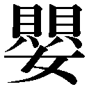 会意。嬰は「女+貝二つ(貝を並べた首飾り)」。首飾りをつけた女の子のこと。また、えんえんとなくあかごのなき声をあらわす擬声語とも考えられる。