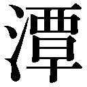 会意兼形声。覃は「西(ざる)+高の逆形」の会意文字で、底の深いざる。潭は「水+音符覃(ふかい)」で、水を深くたたえたふちのこと。深く下に垂れたのを「沈々」と形容するが、その沈や深に近く、ずっしりとぶ厚い意をあらわす。