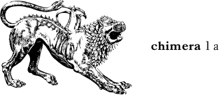 1a [C-] 【ギリシャ神話】 キマイラ, キメラ《ライオンの頭・ヤギの体・竜またはヘビの尾をもち, 口から火を吐く怪獣; Bellerophon に殺された》.