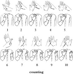 【日英比較】 日本では指で数えるときには親指から折り曲げていくが, 英米では普通は人差し指から小指へと順に立ててゆき, 最後に親指を立てて 5 まで数える. 6 から先は反対の手で同じように人差し指から小指へと立ててゆき, 最後に親指を立てて 10 まで数える. また, 別の数え方では, 指を全部立てておき, 片方の手の人差し指でもう一方の手の親指から小指へ向かって順に指していって 5 まで数え, 6 からは 5 まで数え終わった手の人差し指で, 反対の手の親指から小指へと順に指してゆき, 10 まで数える.