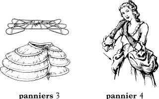 3 パニアー, パニエ《女性がスカートの両サイドを膨ませるために使用した鯨のひげ製などの枠》.