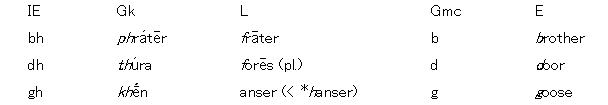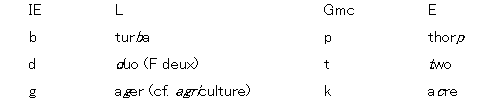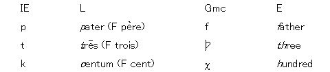 5.1 これはゲルマン語派の諸言語と印欧語族の他の語派の諸言語との間に存在する子音推移を公式化したもので, ドイツの比較言語学者 Jacob Grimm (1785-1863) に因んで Grimm's Law とよぶが, また第一子音推移と称することもある. 分り易くするために, 印欧基語 (IE) の子音をほぼ保存するラテン語 (L) と推移したゲルマン基語 (Gmc) の音韻をもつ英語 (E) の例で示すと次のようになる.