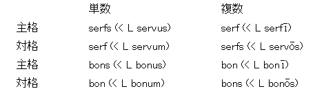 a) フランス語の名詞・形容詞の借入についても, 一般に英語の語形はフランス語の対格によっている. 古期フランス語の名詞・形容詞の格変化は, ラテン語の 5 ないし 6 種の格のうち, 主格と対格の 2 種を残すのみであった. それで serfs '奴隷'と bons 'よい'を例にとり, ラテン語との関係を ( ) 内に示すと