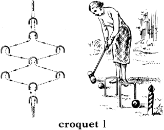 1 クロッケー《通例二人一組(または個人)の 2 組で, 芝生の上で行われるゲーム; 交互に自分の木球を木づち (mallet) で打ち, 出発柱から折返柱の間に置かれた門 (hoops, wickets) を順序に従ってくぐらせ, 早くゴール(出発柱に当てる)した方が勝ちとなる》.