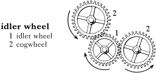 n. 【機械】 遊び車, アイドラー 《二つの歯車・プーリー等の中間に回転方向の変換・中心距離の調節等のために入れる第 3 の歯車・プーリー等》.