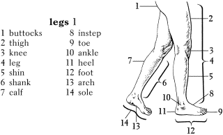 【日英比較】 日本語の「あし」は人・動物の足全体を意味する. 漢字では足, 脚の二つがあるが, その間に際立った違いはなく, ただ「足」がもっとも一般的で, 「脚」は複合語や「机の脚」などの比喩的意味の場合に多く使われる. それに対して英語では足の部分によって言葉が分かれており, leg は人・動物の足の太ももから下の部分全部を指すのに対して, foot は足のくるぶしから下の部分のみを指す語である. ただし, 《米》 ではまた, ひざから足のくるぶしまでの部分を leg とよぶ場合がある. 日本語の「足」がどの部分を指すかは前後関係によるが, 「長い足」「すらりとした足」などの場合は英語では leg, 「足に豆ができる」「足に合わない靴」などの場合は英語では foot である.