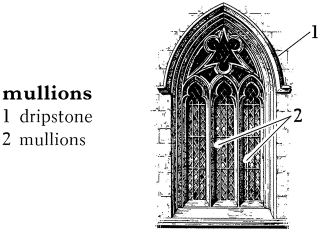 1 【建築】 マリオン《窓の縦仕切り; cf. transom 1 a》, 中方(なかほう)立て; 丸窓の放射状仕切り.🔗⭐🔉