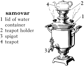 n. サモワール《ロシアのお茶用湯沸かし; 通例銅製で中央に炭火を入れる》.🔗⭐🔉