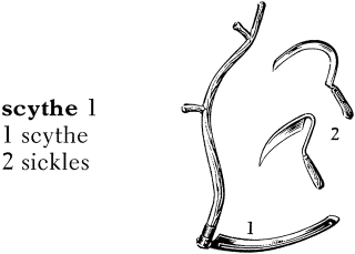 1 (長柄の)大鎌《中世には主に武器, 一般には草刈り用などの農具; 死神の持ち物とされる》.