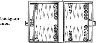 1 バックギャモン《2 個の遊戯箱 (tables) の上の各 12 個のとがり部分 (points) の盤上で, 2 個のさいを振って各 15 個のこま (men) を動かす二人用の西洋すごろく》.