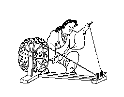 車と紡錘(ツム)から成る道具。手で車を回して糸をつむいだりよりをかけたりする。糸車。紡車。